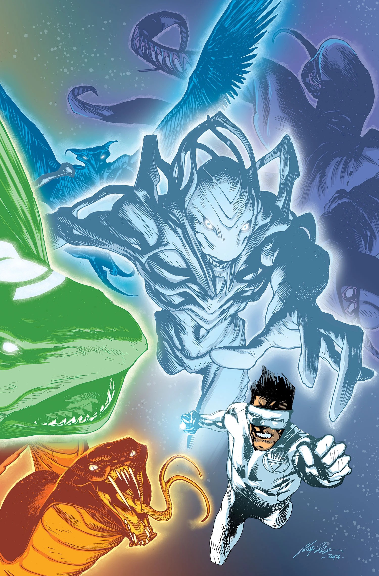 The Life Entity and its host the White Lantern Kyle Rayner alongside the entities of the Emotional Spectrum. From Green Lantern: New Guardians v1 #24 Textless Cover.
