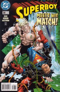 The genetic construct known as Match was unveiled as the ultimate secret weapon of the Agenda, a shadowy organization dedicated to engineering metahumans. He emerged from a gestation tank as an exact physical and tactical duplicate of Superboy, possessing the same appearance, memories, and tactile telekinesis as the original. Upon his release, he immediately engaged his progenitor in a brutal, high-speed battle throughout the Agenda’s secret facility, utilizing his lack of moral restraint to gain a vicious upper hand. He mocked Superboy’s perceived weaknesses and his attachment to humanity, demonstrating a cold, superior efficiency in combat that nearly overwhelmed the young hero. Throughout the encounter, he acted as a dark mirror, matching every move and power usage with terrifying precision, while his handlers observed the success of their "perfected" version of the Boy of Steel. Although the confrontation ended in a stalemate when the facility began to self-destruct, he successfully established himself as a lethal rival, escaping into the night with the intent to eventually replace the original Superboy entirely. (Superboy v4 #35) The clone fully emerged from his stasis to confront the original Superboy within the collapsing ruins of the Agenda's laboratory. He immediately asserted his dominance by displaying a more ruthless and focused application of their shared tactile telekinesis, catching the real Superboy off guard with the sheer intensity of his assault. Throughout the skirmish, he relentlessly taunted his progenitor, claiming that he was the 'perfected' version of the genetic template and that the original was a flawed, emotional failure. He utilized his identical appearance to disorient the heroes, moving with a calculated speed that demonstrated his superior combat programming. Despite the escalating destruction of the facility, he remained fixated on proving his superiority, and as the base was consumed by fire and explosions, he vanished into the chaos, leaving the real Superboy shaken by the realization that a cold-blooded mirror of himself was now loose in the world. (Superboy v4 #36)