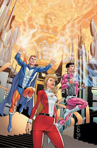 Lightning Lad and Saturn Girl took Graym to the resort planet of Rojavis for a family vacation. They decided that it would be a challenge to be parents and Legionnaires at the same time, but decided it was worth it and planned to travel to Earth to re-join their comrades. (Legion of Super-Heroes v3 #10) The entire Legion of Super-Heroes held a quorum to deal with Legion business that’d been kicked down the road for months. Lightning Lad and Saturn Girl re-joined the team, and after the meeting they met with Cosmic Boy to reflect on their past. Cosmic Boy said they provided a sense of continuity since they were the original Legionnaires, and they all started to feel a little bit old. Lightning Lass was pleased to see they had brought her nephew Graym with them, and the child started amusing himself by tweaking people’s nose. Saturn Girl, Cosmic Boy and Lightning Lad visited Glacier Point, Antarctica, home to a medium-security prison, because the two men who had tried to assassinate R.J. Brande years ago were up for parole. They reflected on how that assassination attempt brought them together for the first time, and were surprised that when they told the inmates they were free to go they didn’t recognize the Legionnaires at all, hitting home the point home much things had changed for the Legion after so many years. (Legion of Super-Heroes v3 #11)