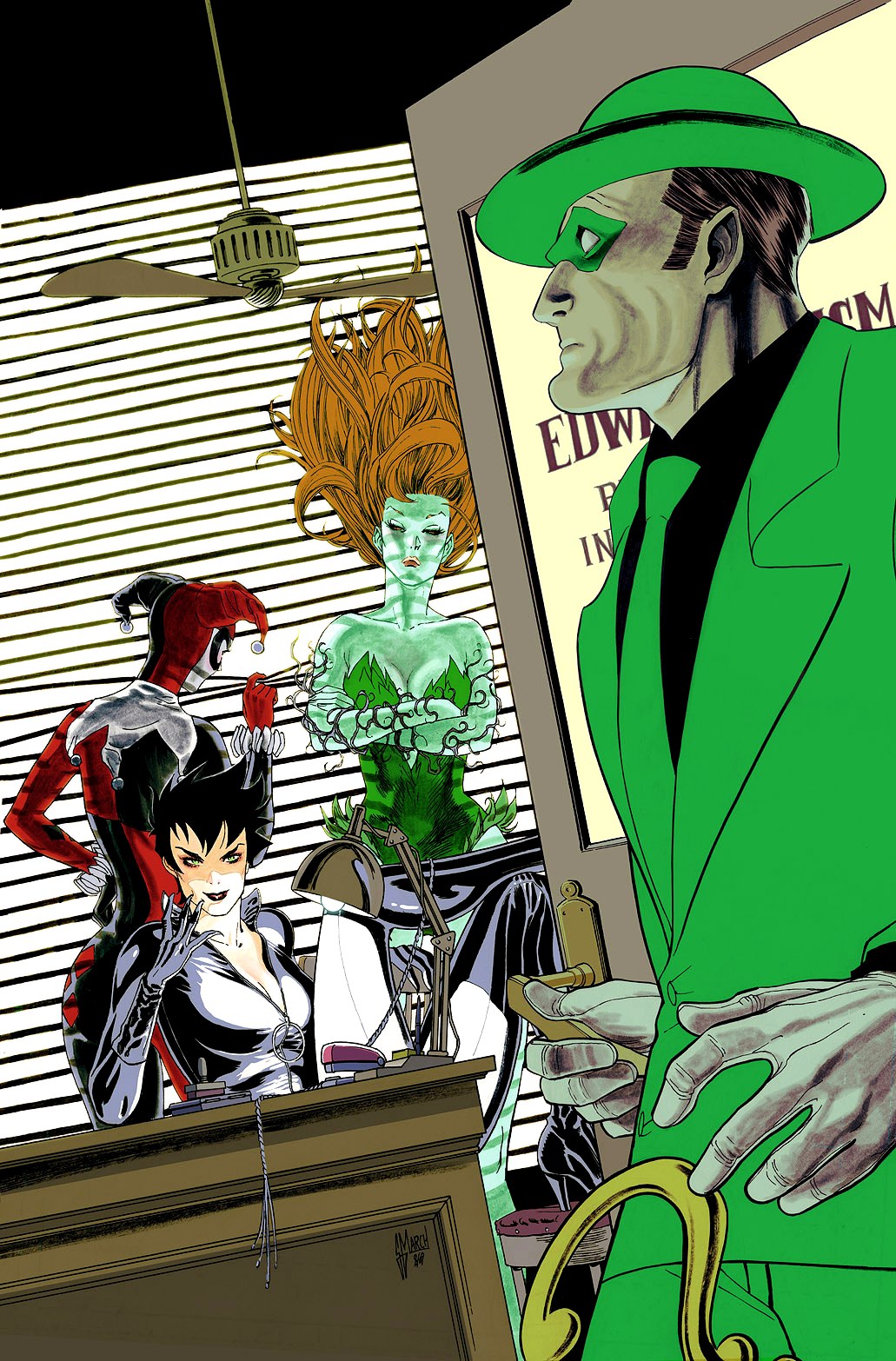 Catwoman, Poison Ivy and Harley Quinn in the office of the Riddler. From Gotham City Sirens v1 #9 Textless Cover.