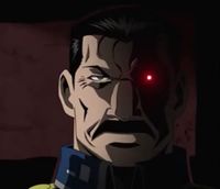 King Bradley (Japanese: キング・ブラッドレイ, Hepburn: Kingu Buraddorei) was a male member of the military of the land of Amestris. He was actually an orphan that was raised by the military with his name being unknown but was one of many such children that were taken in as part of a secretive experimental program. This program was headed by Father who secretly controlled the Amestrian government. Through his backing, a training regimen was created in order to breed the public ruler of Amestris with the successful candidate being Fuhrer. The boy that would become King Bradley was designated as the twelfth subject where he engaged in a brutal training regime as he was trained to become his country's new ruler. By the time of adulthood, the second phase of the experiment was ready whereby the Philosopher's Stone was injected into the candidates. This was with the intention of turning them into a Homunculi but the majority of the test subjects died. This was until the twelfth subject who was injected with the distilled Stone in liquid form and after excruciating pain his body bean to accept it. Thus, he became a human Homunculi that was designated as Wrath (ラース Rāsu) the Furious and the final of Father's children. The military provided him a background and a name where he became known as King Bradley. In time, he came to rule Amestris as its public leader all the while bringing about the final stage of Father's plan to completion. At some point, he encountered a woman that he grew to love and married her where she lived as his wife though she was unaware of her husband's true nature. To support Wrath, Pride was dispatched to masquerade as the couple's son Selim where they appeared as an ordinary family to outsiders. As Fuhrer, he secretly instituted a number of military campaigns in order to bring about as much death as possible as this was desired by Father for the fulfillment of his goals. Only the top hierarchy of the Amestrian military were aware of his true nature as a Homunculi and supported Father in his goals as they sought immortality.