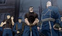 Afterwards, he went to the hospital to check on Edward and Alphons Elric following their encounter with Lust and Envy in the Fifth Laboratory. He then learnt that the pair had ben conducting hidden research on the Philosopher's Stone that led them to the lab. Whilst there, Bradley seemingly hinted at the possibility of traitors within the ranks of the upper echelon's of the military. He then ordered the Elrics along with Lt. Colonel Maes Hughes and Major Alex Louis Armstrong to watch their backs and to avoid the secret organisation conducting these hidden alchemical experiments.