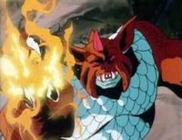 The giant Inhumanoid regularly bathed in lava which did not harm his body. It had great rejuvenating effects on his body and through the Earth's core he could enter a period of regeneration where he was covered in a stream of fire that descended over his form. Through the lava, he made use of a type of power called Primal Energy which he used to great effects. By taking the flaming liquid in his hands, he was capable of feeding it into the mouth's of statues which empowered them with life thus turning them into his Statue Warriors. However, they required a constant source of this nourishment otherwise they would weaken and could even be further weakened by sapping away this energy through the use of cold based attacks.