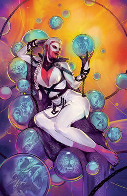 In appearance, Mother Righteous was a beautiful female humanoid being with red skin and long white hair. Her face had numerous white sigil markings on the side with a heart being located at the centre of her forehead. Typically, she wore a domino mask that hid the heart symbol from others. It was shown that she tended to dress in all-white clothing. (Legion of X v1 #10) In reality, she was based on the long dead wife of Nathaniel Essex namely Rebecca. (X-Men v6 #23)