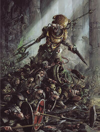 In prior editions of Warhammer (and now restored in the most recent edition), the Skaven at times would be led by daemonic beings called Vermin Lords. Believed to be some sort of Avatar of the Horned Rat, Vermin Lords were greater daemons that even the Grey Seers feared and acquiesced themselves to. Grey Seers often threaten to summon a Vermin Lord to ensure obedience, but in truth, they are loath to do so as these creatures are more powerful and cunning than any living Skaven and their lust for power and love of betrayal are legendary.